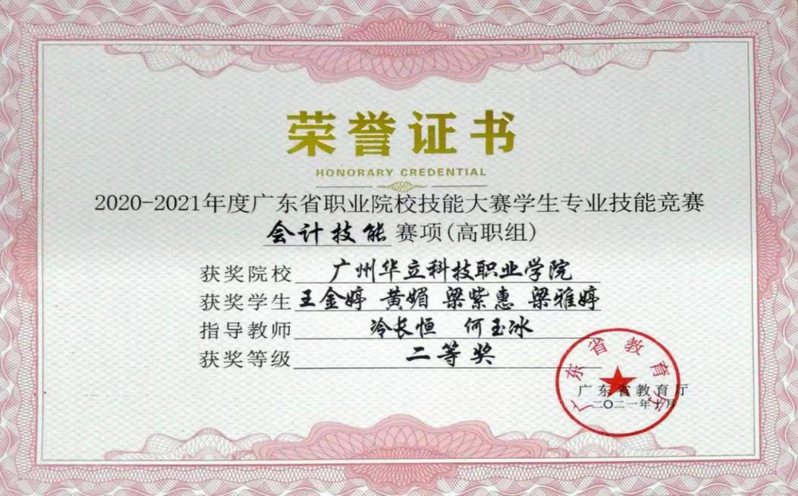 冷長恒、何玉冰老師指導(dǎo)學(xué)生參加省級職業(yè)技能(會計(jì)技能)競賽獲得二等獎(jiǎng)