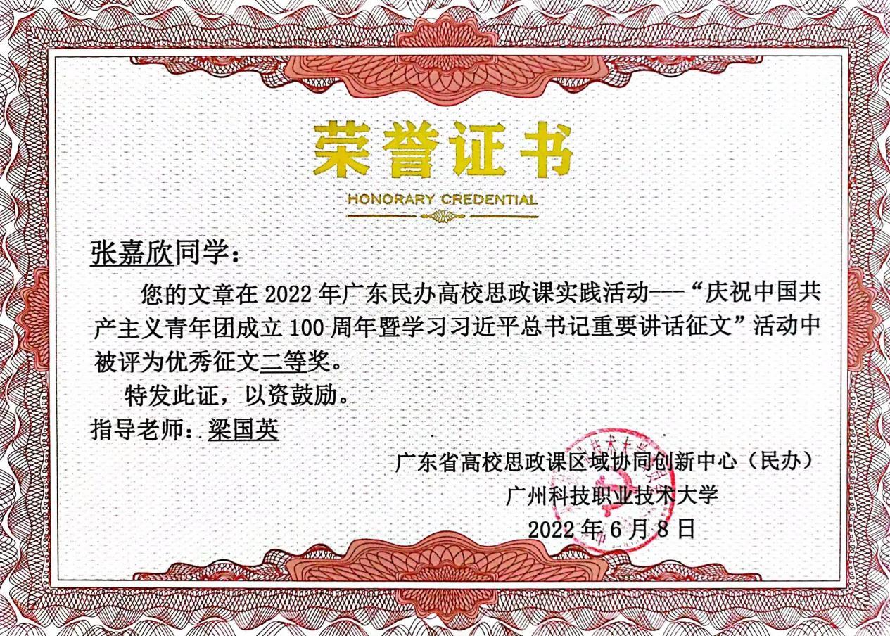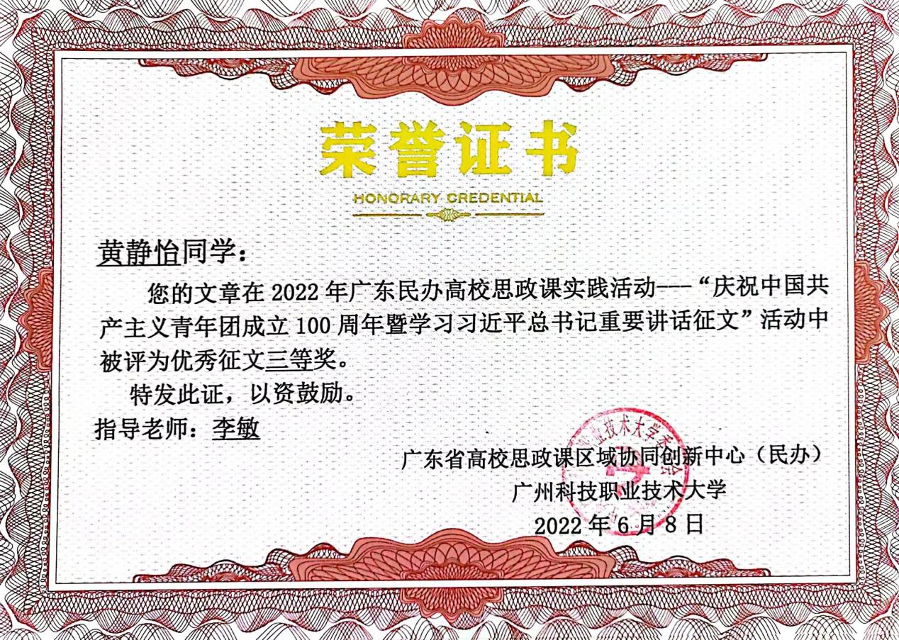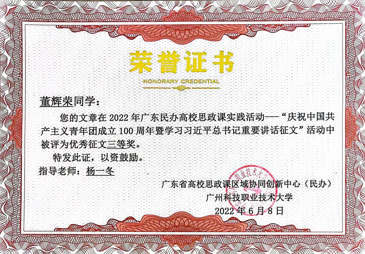 我校學(xué)生在廣東民辦高校大學(xué)生“慶祝中國(guó)共產(chǎn)主義青年團(tuán)成立100周年暨學(xué)習(xí)習(xí)近平總書(shū)記重要講話”征文活動(dòng)中榮獲佳績(jī)