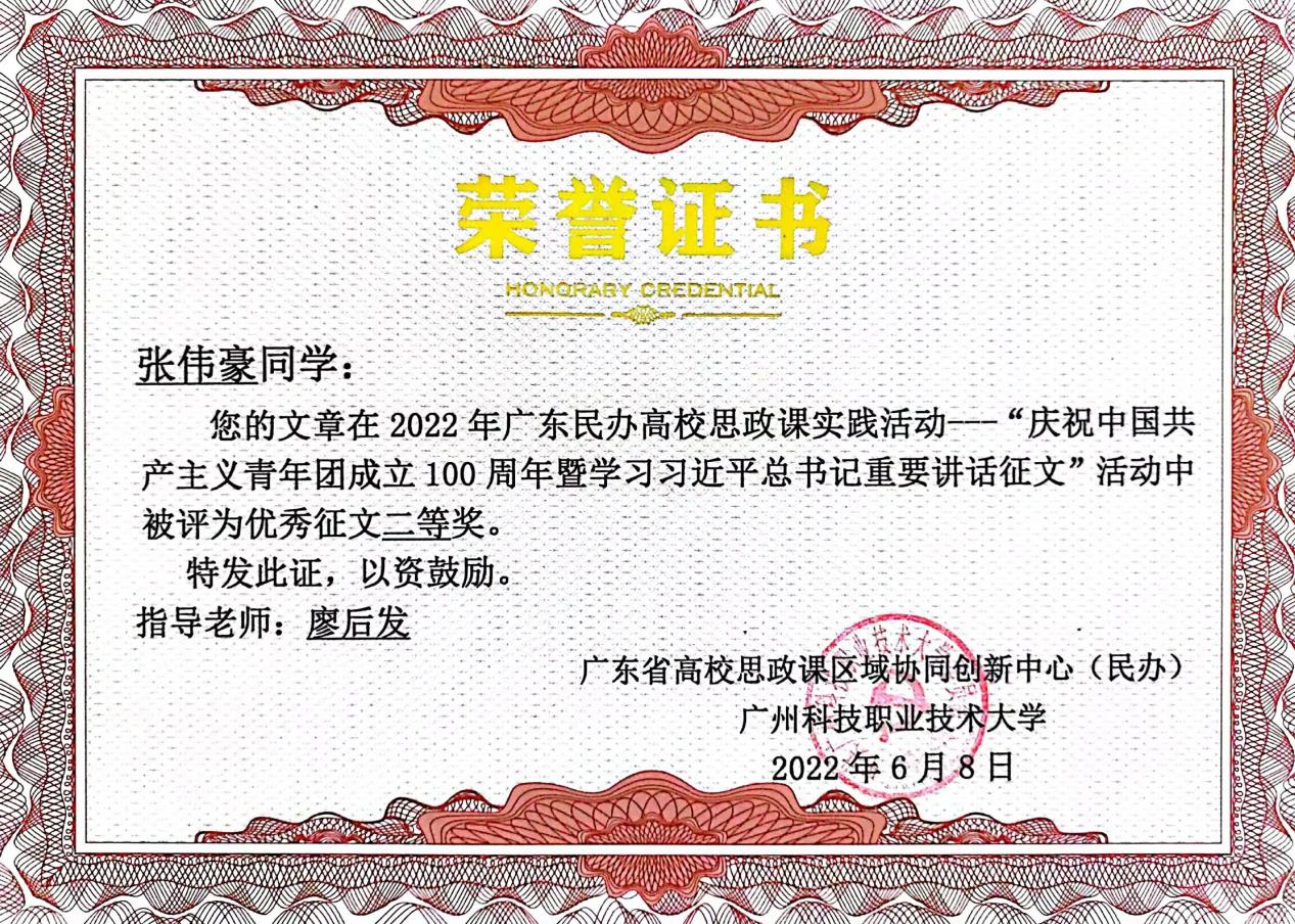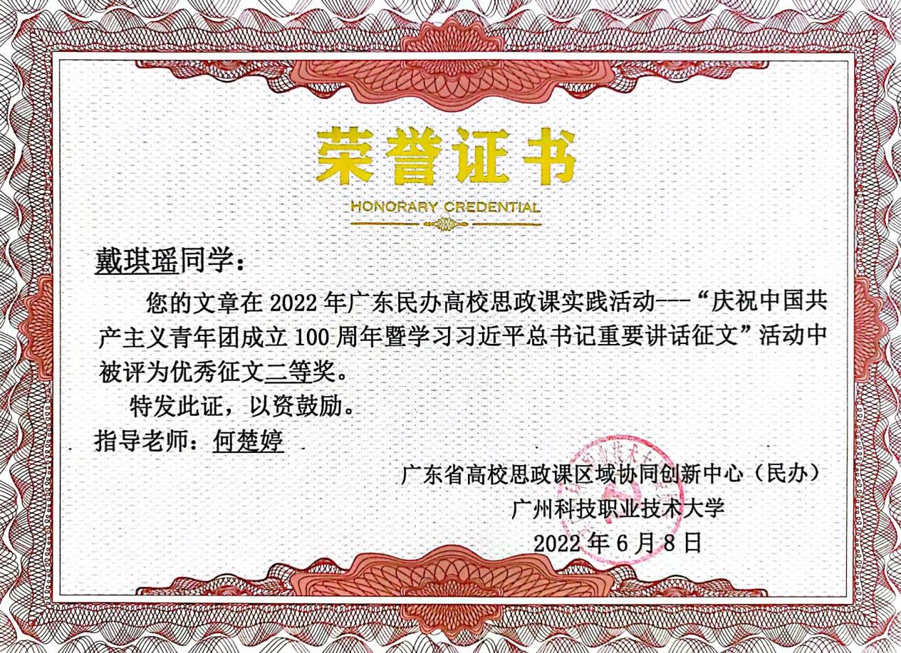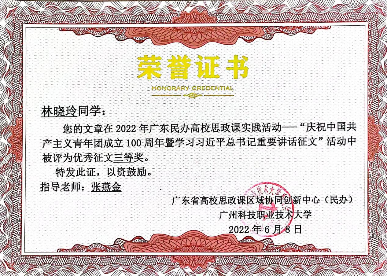 我校學(xué)生在廣東民辦高校大學(xué)生“慶祝中國(guó)共產(chǎn)主義青年團(tuán)成立100周年暨學(xué)習(xí)習(xí)近平總書(shū)記重要講話”征文活動(dòng)中榮獲佳績(jī)