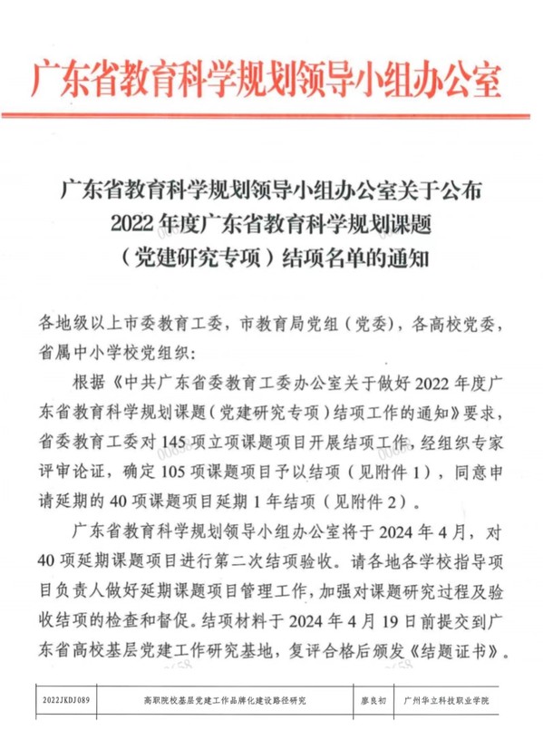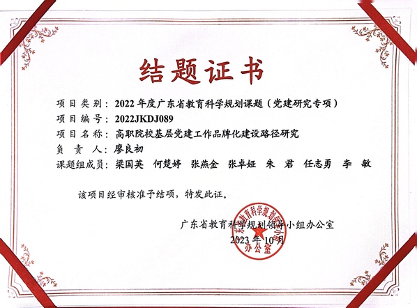 近日,廣東省教育科學規(guī)劃領導小組辦公室近日公布2022年度廣東省教育科學規(guī)劃課題(黨建研究專項)結項名單,廣東省委教育工委對145項立項課題項目開展結項工作,經(jīng)組織專家評審論證,確定105項立項課題予以結項。我校馬克思主義學院廖良初教授主持的《高職院?;鶎狱h建工作品牌化建設路徑研究》(2022JKDJ089)課題順利結項。