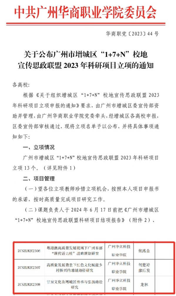 近日,由廣州市增城區(qū)區(qū)委宣傳部牽頭組織的增城區(qū)校地宣傳思政聯(lián)盟,發(fā)布了《關(guān)于組織“1+7+N”2023年科研項(xiàng)目立項(xiàng)申報(bào)通知》(華商職黨【2023】44號(hào)),經(jīng)增城區(qū)各高校申報(bào),區(qū)委宣傳部審核通過(guò),共有13個(gè)項(xiàng)目立項(xiàng)。我校馬克思主義學(xué)院張燕金副教授主持的《粵港澳高質(zhì)量發(fā)展視域下廣州東部“現(xiàn)代活力核”戰(zhàn)略規(guī)劃研究》(ZCSZLM202306)、何楚婷副教授、廖后發(fā)老師主持的《高質(zhì)量發(fā)展背景下紅色文化賦能鄉(xiāng)村振興的增城路徑研究》(ZCSZLM202307)、龍林副教授主持的《甘泉文化在增城區(qū)傳承與弘揚(yáng)路徑研究》(ZCSZLM202308)課題獲得立項(xiàng)。