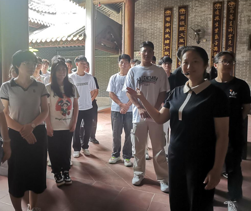 在這堂特殊的思政課中,學(xué)生們跟隨老師的步伐,一同走進位于增城新塘鎮(zhèn)群星村的篤菴湛公祠。經(jīng)湛氏后裔湛偉健先生的介紹,湛篤菴是新塘湛氏二世祖,其父湛露為新塘湛氏的開宗始祖,其弟湛晚丁的六世孫即為湛若水。篤菴湛公祠見證了湛氏家族的歷史變遷,也承載著湛若水先生的精神遺產(chǎn)。在祠堂內(nèi),學(xué)生們認真聆聽湛偉健先生講述湛氏家族的歷史故事,了解了新塘湛氏的起源、二世祖篤菴公的事跡,以及三世祖湛懷德保衛(wèi)鄉(xiāng)民、平息叛亂的忠義之事。隨后,另一位湛氏后裔湛柏欣先生則講述湛若水的生平事跡,了解他一生為學(xué)、為官的堅韌與執(zhí)著。