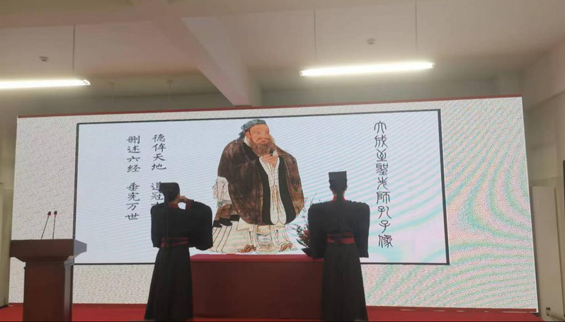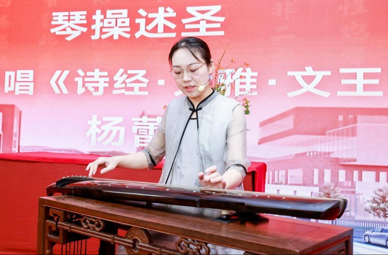 隨后,古琴?gòu)V陵派第十四代傳人、青年藝術(shù)家楊蕾演奏了《弦歌《大雅·文王》,悠揚(yáng)古樸的琴聲為活動(dòng)拉開帷幕。而后,眾人一起誦讀了《史記·孔子世家贊》《中庸》里贊頌孔子的經(jīng)典文段,向孔子行敬師禮,進(jìn)獻(xiàn)素花,以此傳揚(yáng)圣人之德,表達(dá)對(duì)孔子的追慕之情。