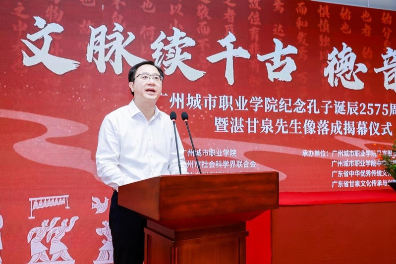 為傳承中華優(yōu)秀傳統(tǒng)文化,打造區(qū)域文化品牌,9月25日上午,紀(jì)念孔子誕辰2575周年慶典暨湛甘泉先生像落成揭幕儀式在廣州城市職業(yè)學(xué)院隆重舉行。我院院長(zhǎng)廖良初和本院教師、廣州市甘泉文化研究會(huì)秘書長(zhǎng)黃宇惠等多人應(yīng)邀赴會(huì)。