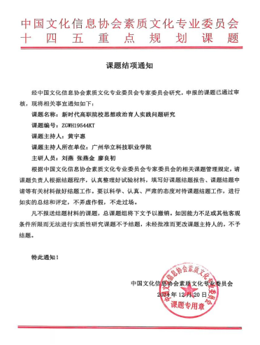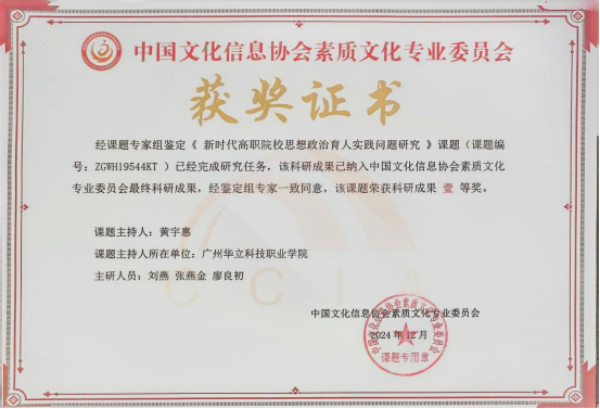 近日,從中國文化信息協(xié)會素質(zhì)文化專業(yè)委員會傳來消息,我院黃宇惠老師主持申報的2024年度中國文化信息協(xié)會素質(zhì)文化專業(yè)委員會“十四五”重點規(guī)劃課題——新時代高職院校思想政治育人實踐問題研究(課題編號:ZGW19544KT)順利結(jié)題。經(jīng)鑒定組專家評審,一致同意,該課題榮獲科研成果一等獎。