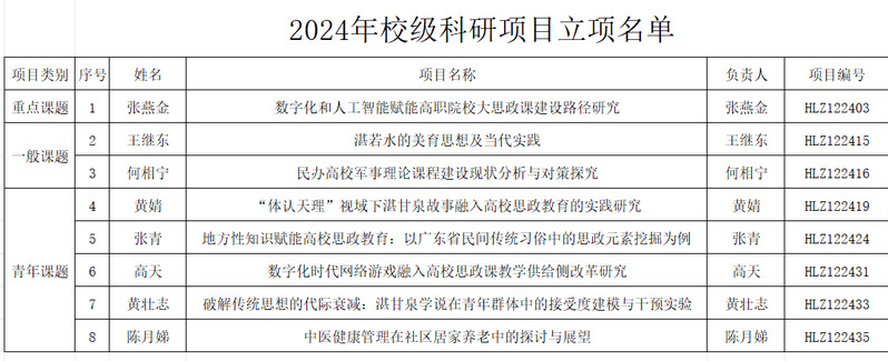 本次立項課題,聚焦學校高質(zhì)量發(fā)展、教育教學改革、服務(wù)文化強市等重要問題,涵蓋“數(shù)字化和人工智能賦能高職院校大思政課建設(shè)路徑研究”“湛若水思想文化影響”“廣東省民間傳統(tǒng)習俗中的思政元素”等方向,研究視域廣,選題角度新,研究方法多,兼具學術(shù)價值與實踐意義,可望催生出一批有價值的研究成果。