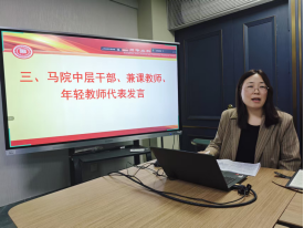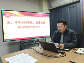 隨后,馬克思主義學(xué)院行政人事負(fù)責(zé)人李權(quán)、任課教師張卓婭、青年教師焦揚、王繼東分別以不同身份代表發(fā)言表態(tài)。大家表示要嚴(yán)格落實學(xué)院各項決策部署,深耕思政課堂教學(xué),聚焦科研能力提升,積極參與各類思政科研項目申報,嚴(yán)把意識形態(tài)關(guān),努力完成各自崗位職責(zé)。