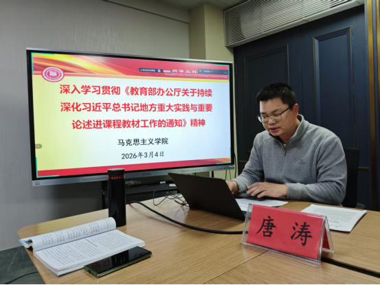 首先,馬克思主義學(xué)院院長助理、院黨支部組織員唐濤,傳達(dá)了《教育部辦公廳關(guān)于持續(xù)深化習(xí)近平總書記地方重大實踐與重要論述進(jìn)課程教材工作的通知》精神。