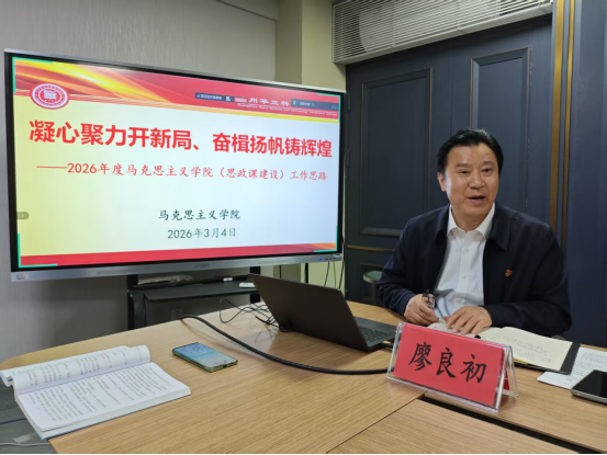 接著,馬克思主義學(xué)院院長廖良初教授,就2026年馬克思主義學(xué)院建設(shè)和發(fā)展談了自己的工作思路并作出了周密安排。他指出2026年是國家“十五五”規(guī)劃的開局之年,是學(xué)校迎接教育部辦學(xué)能力評價的關(guān)鍵之年,馬克思主義學(xué)院和全體思政課教師要用高標(biāo)準(zhǔn)、嚴(yán)要求抓好今年的各項工作。他從規(guī)范管理,營造積極向上的工作氛圍抓好行政人事工作;突出中心,建造粲然可觀的教學(xué)業(yè)績抓好教學(xué)教研工作;強化科研,創(chuàng)造特色鮮明的研究成果抓好科研社會服務(wù)工作;黨建引領(lǐng),打造廉潔高效的戰(zhàn)斗堡壘抓好黨務(wù)宣傳工作。廖院長的報告全面深刻,目標(biāo)明確,思路清晰,措施得力。他希望全體同仁發(fā)揚龍馬精神,以飽滿的熱情和扎實的學(xué)風(fēng),深耕主責(zé)主業(yè),不斷提升馬克思主義學(xué)院的教學(xué)、科研、黨建、行政工作實力,不斷提升思政課的“到課率”“抬頭率”和“點頭率”,為培養(yǎng)擔(dān)當(dāng)民族復(fù)興大任的時代新人貢獻(xiàn)“思政人”的智慧和力量。