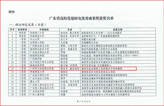 近日,廣東省高等學(xué)校黨的建設(shè)研究會(huì)公布了高校黨建研究?jī)?yōu)秀成果獎(jiǎng)獲獎(jiǎng)名單,全省共有103項(xiàng)成果獲獎(jiǎng),其中民辦高職院校只有3個(gè)項(xiàng)目上榜。我校黨委書(shū)記陳良聲、馬克思主義學(xué)院院長(zhǎng)廖良初組織思政課教師主編的《新時(shí)代民辦高校入黨積極分子培訓(xùn)教程》榮獲理論研究成果(專(zhuān)著類(lèi))二等獎(jiǎng),該獎(jiǎng)項(xiàng)全省共評(píng)出20項(xiàng),我校是該獎(jiǎng)項(xiàng)唯一獲獎(jiǎng)的高職院校。