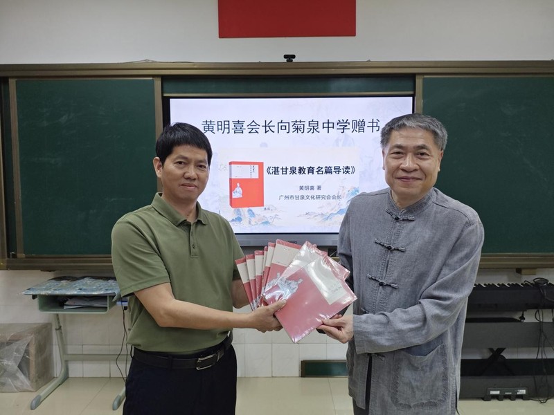 座談會上黃明喜會長向菊泉中學贈送了他最近出版的新書《湛甘泉教育名篇導讀》。