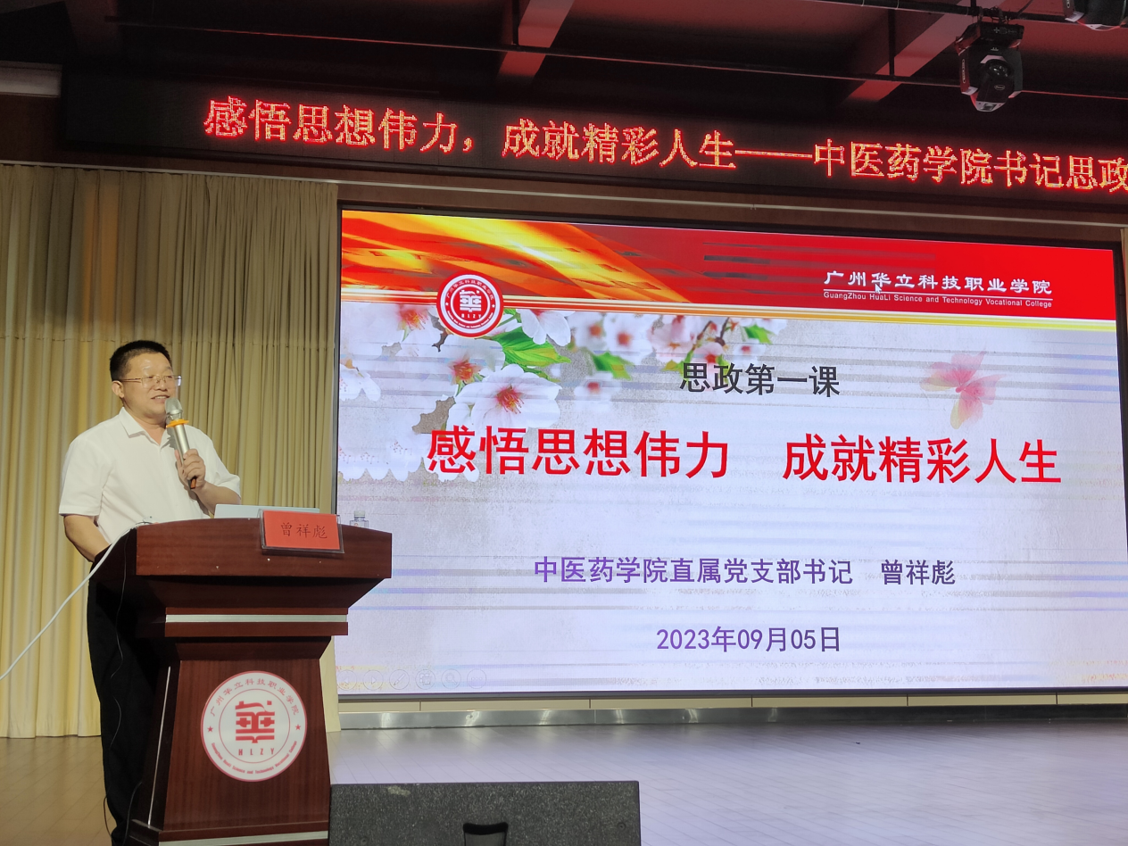 凝心聚力秋風(fēng)勁,奮蹄揚(yáng)鞭正當(dāng)時(shí)。為深入貫徹習(xí)近平總書記關(guān)于“大思政課”建設(shè)的重要指示精神,進(jìn)一步落實(shí)立德樹人根本任務(wù),推進(jìn)習(xí)近平新時(shí)代中國特色社會主義思想進(jìn)教材、進(jìn)課堂、進(jìn)頭腦,2023年9月5日晚,在圖書館八樓演播廳,中醫(yī)藥學(xué)院直屬黨支部書記曾祥彪為1300余名2023級新生帶來了入學(xué)思政第一課。