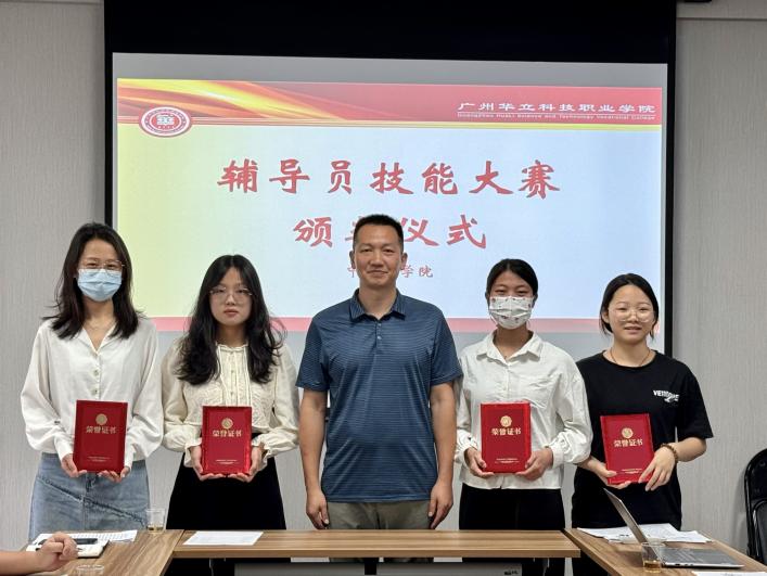 黨支部專職副書記陳輝為三等獎等獎獲得者馬連連、劉嘉楣、謝梓婷、王雯雯頒獎