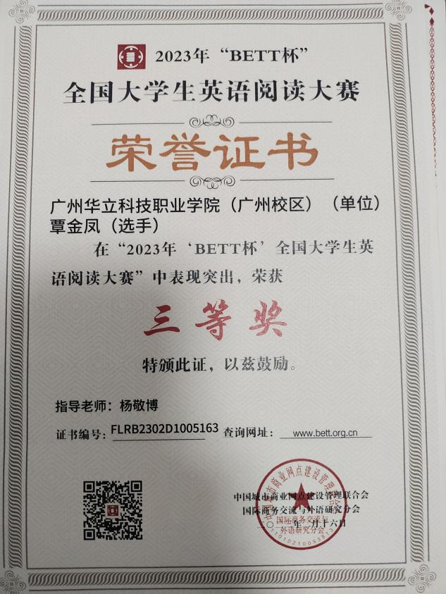 覃金鳳,21中醫(yī)3班,中共預備黨員,現(xiàn)在暨南大學附屬第一醫(yī)院實習。在校期間,曾獲得優(yōu)秀學生干部、優(yōu)秀迎新志愿者、優(yōu)秀輔導員助理、好書分享人等多項榮譽稱號;并獲得了優(yōu)秀學生一等獎學金、華立職院獎學金、國家獎學金;在競賽方面,獲得“全國大學生英語翻譯大賽”高職高專組省級三等獎、“2023年‘BEET杯’全國大學生英語閱讀大賽”三等獎、“第十二屆贏在廣州暨粵港澳大灣區(qū)大學生創(chuàng)業(yè)”校賽一等獎等20項。