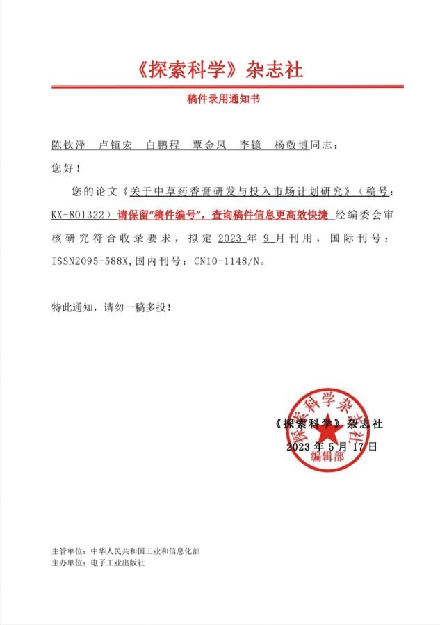 此外,她特別關(guān)注各類競賽,注重提升自身對知識的應用和轉(zhuǎn)化能力,全面發(fā)展自己,努力成為一名綜合素養(yǎng)高的大學生。她參與的創(chuàng)新創(chuàng)業(yè)項目《醫(yī)香情苑——關(guān)于中草藥香膏研發(fā)與投入市場計劃》在第二屆贏在廣州校賽中獲得了一等獎,并以第四作者的身份在《探索科學》上發(fā)表了論文《關(guān)于中草藥香膏研發(fā)與投入市場研究》。為了能夠鞭策自己學習英語,她還積極參加各項英語競賽,在2023年“中外傳播杯”全國大學生英語詞匯大賽中獲得了高職高專組三等獎,共計獲得英語類競賽獎項6個。不管是網(wǎng)絡(luò)知識競賽,還是校園內(nèi)舉辦的各項技能比賽,只要能夠進入到她的視野中,她都積極參與并獲得了許多獎項。