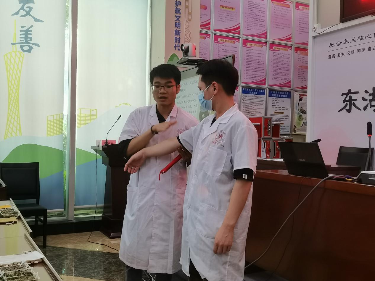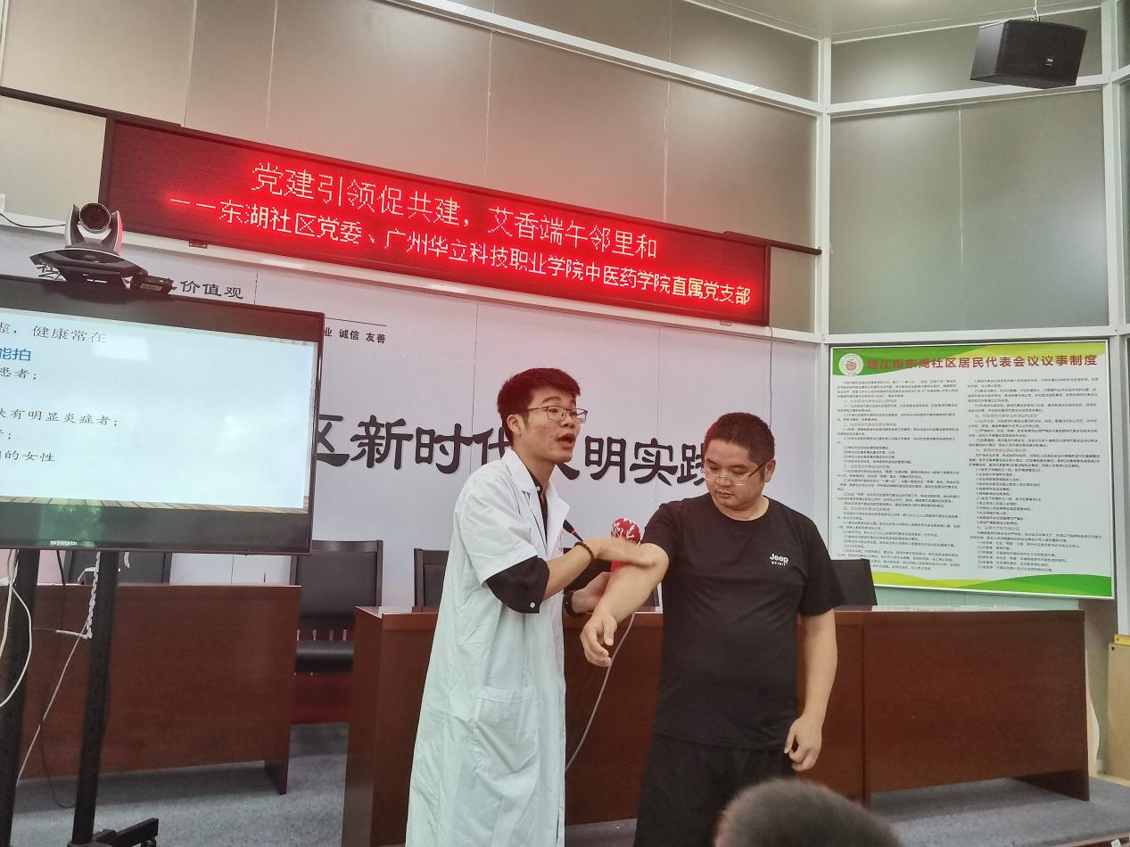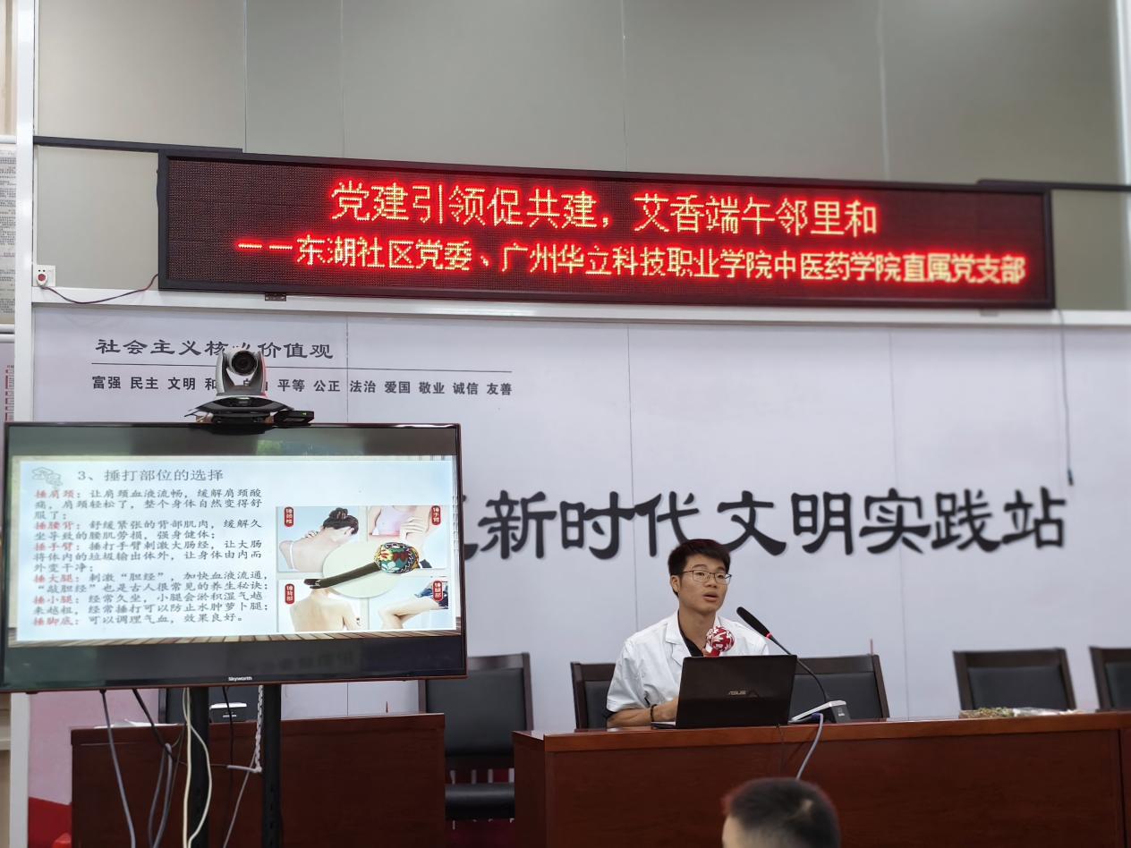 活動(dòng)開(kāi)始,我院鐘明華老師利用ppt向居民科普艾草捶的由來(lái)、作用及使用的方法?!鞍~苦、辛,性溫,入肝、脾、腎經(jīng),具有緩解疼痛、溫經(jīng)止血、祛濕止癢、促進(jìn)消化等作用”,鐘明華老師詳細(xì)講解艾葉的作用,小朋友及家長(zhǎng)們專心致志的聽(tīng)著,并拿起眼前的艾葉進(jìn)行觀察。隨后,鐘明華老師通過(guò)圖片展示拍八虛的具體部位,為了讓家長(zhǎng)能夠正確掌握捶打的方法和力度,鐘明華老師還與我院學(xué)生志愿者進(jìn)行現(xiàn)場(chǎng)演示,不少家長(zhǎng)積極參與體驗(yàn),并紛紛贊嘆中醫(yī)文化的魅力。