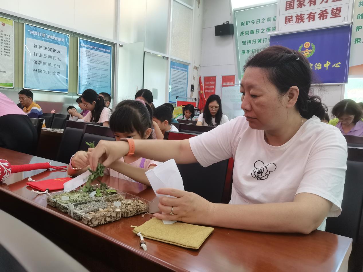 “戴個(gè)香囊袋,不怕五蟲(chóng)害”,香囊又名香袋、花囊、荷包等,本次活動(dòng)制作的香囊的成分由8味中藥材組成,配方也是我院中醫(yī)教師特別調(diào)配。在正式制作香囊前,鐘明華老師帶領(lǐng)大家學(xué)習(xí)香囊的文化、起源、意義以及用途,普及藥材功效。隨后,小朋友和家長(zhǎng)們按照稱取藥材、塞藥包、打結(jié)等步有條不紊地制作香囊,現(xiàn)場(chǎng)氛圍極其熱鬧,25對(duì)親子最終也圓滿完成了香囊的制作。