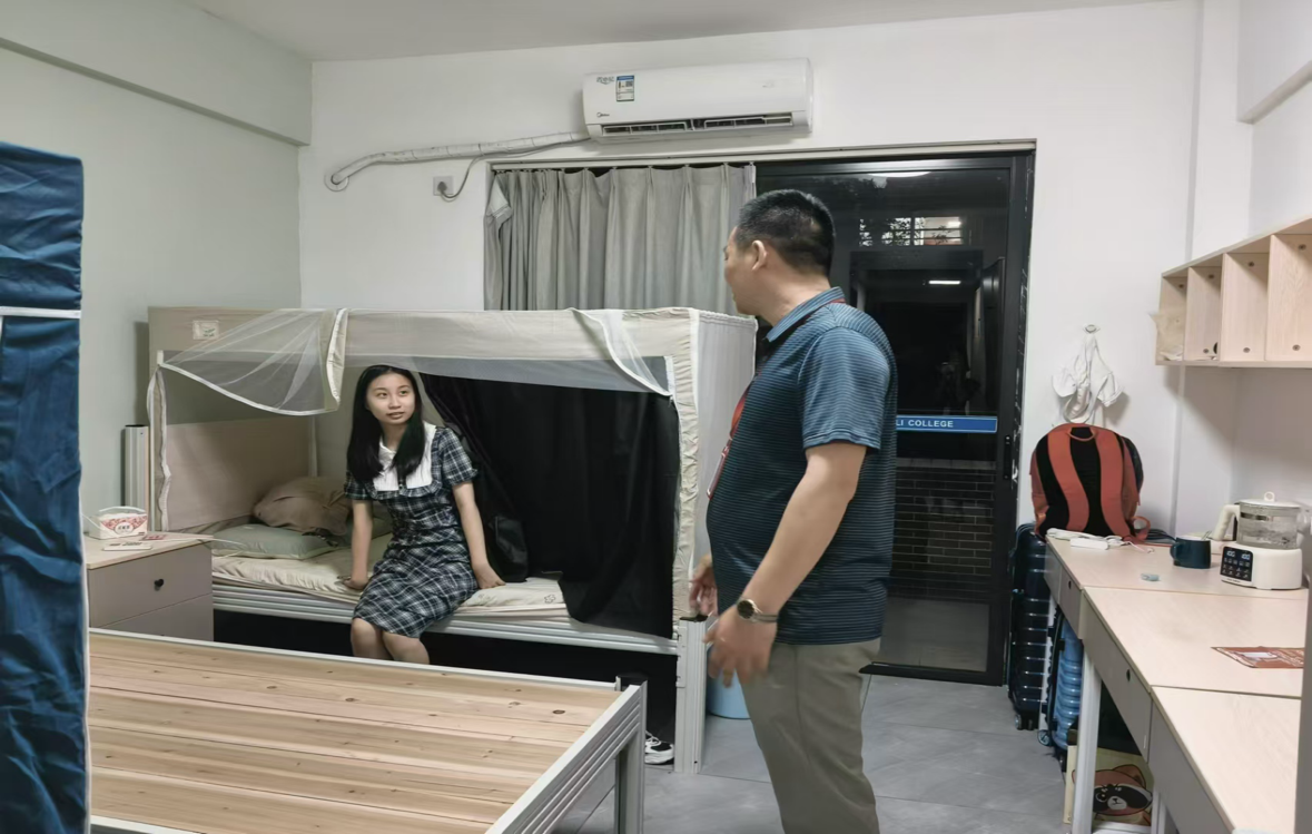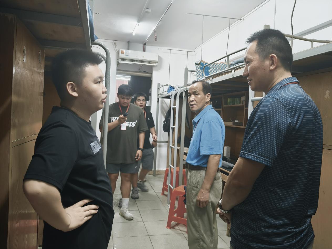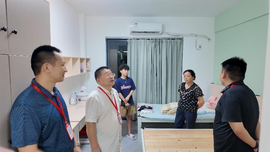 圖為中醫(yī)藥學(xué)院王暉院長與陳輝主任查看宿舍設(shè)施配置并慰問新生