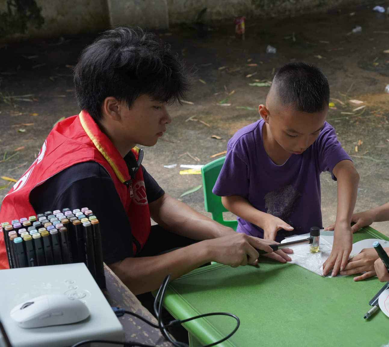 課程結(jié)束后,突擊隊(duì)員們開展了植物拓印活動(dòng),突擊隊(duì)員們帶領(lǐng)小朋友將提前處理好的植物使用橡膠錘將其汁液錘出,印在紙扇子上,并用畫筆畫上生動(dòng)的圖案,制作出了富有童趣且豐富多彩的作品,現(xiàn)場氣氛熱烈,歡聲笑語此起彼伏。