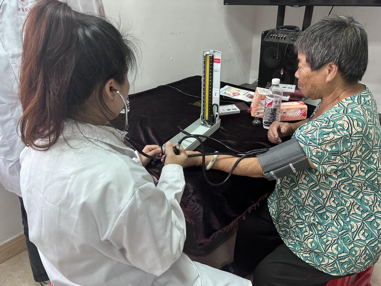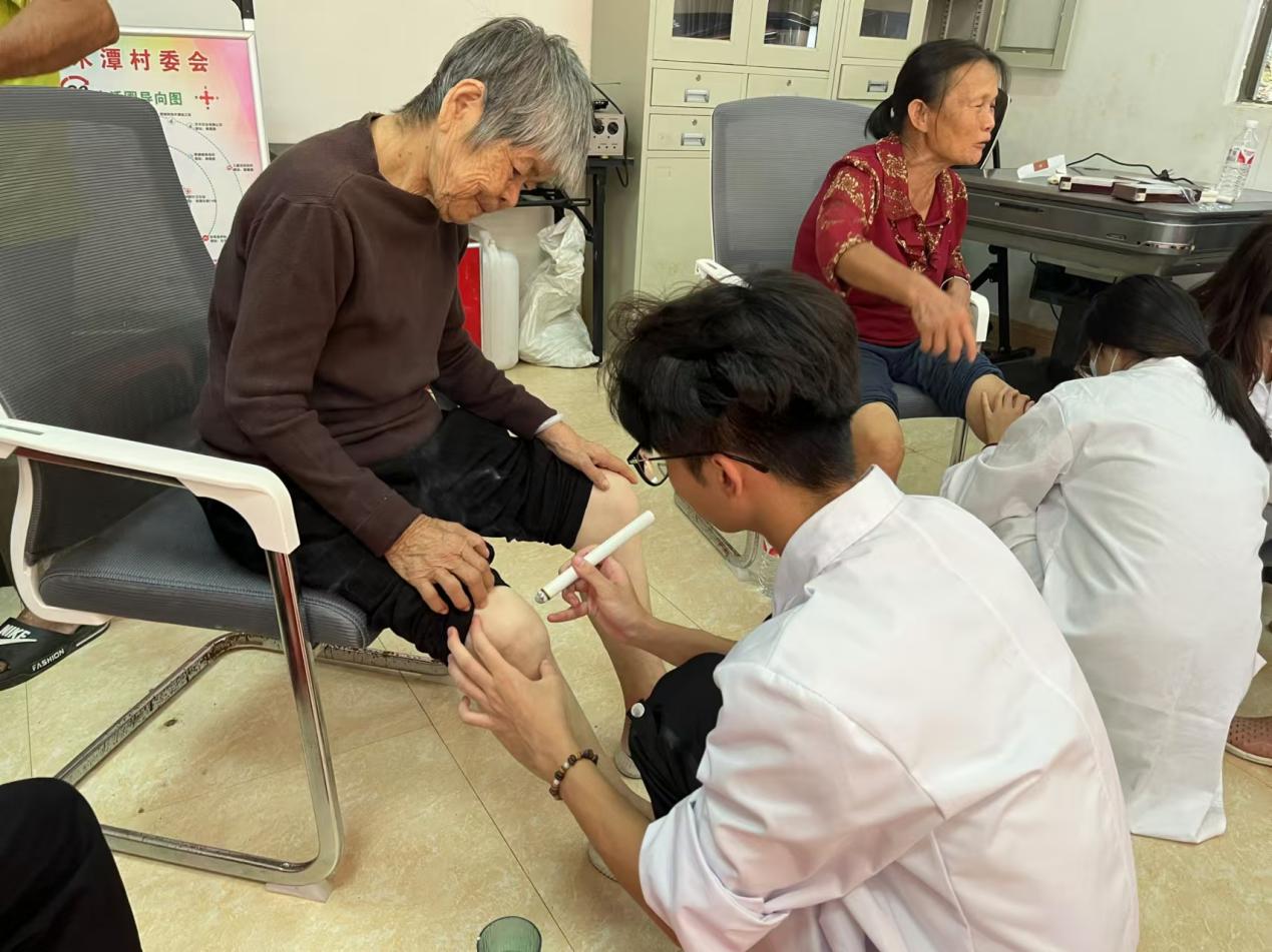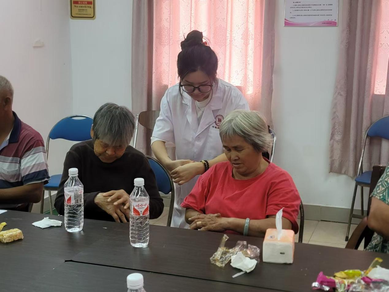 講座結(jié)束后,鐘老師指導(dǎo)志愿者們開展測(cè)量血壓、艾灸、推拿等中醫(yī)理療服務(wù)。在服務(wù)過(guò)程中,志愿者們?yōu)榇蠹抑v解艾灸的操作方法和注意事項(xiàng),針對(duì)一些基礎(chǔ)穴位進(jìn)行仔細(xì)講解并進(jìn)行手把手教學(xué)。此外,志愿者還用專業(yè)的手法進(jìn)行推拿,幫助他們緩解身體的不適,并根據(jù)個(gè)人需求和身體狀況推薦一些基礎(chǔ)的自我保健手法。