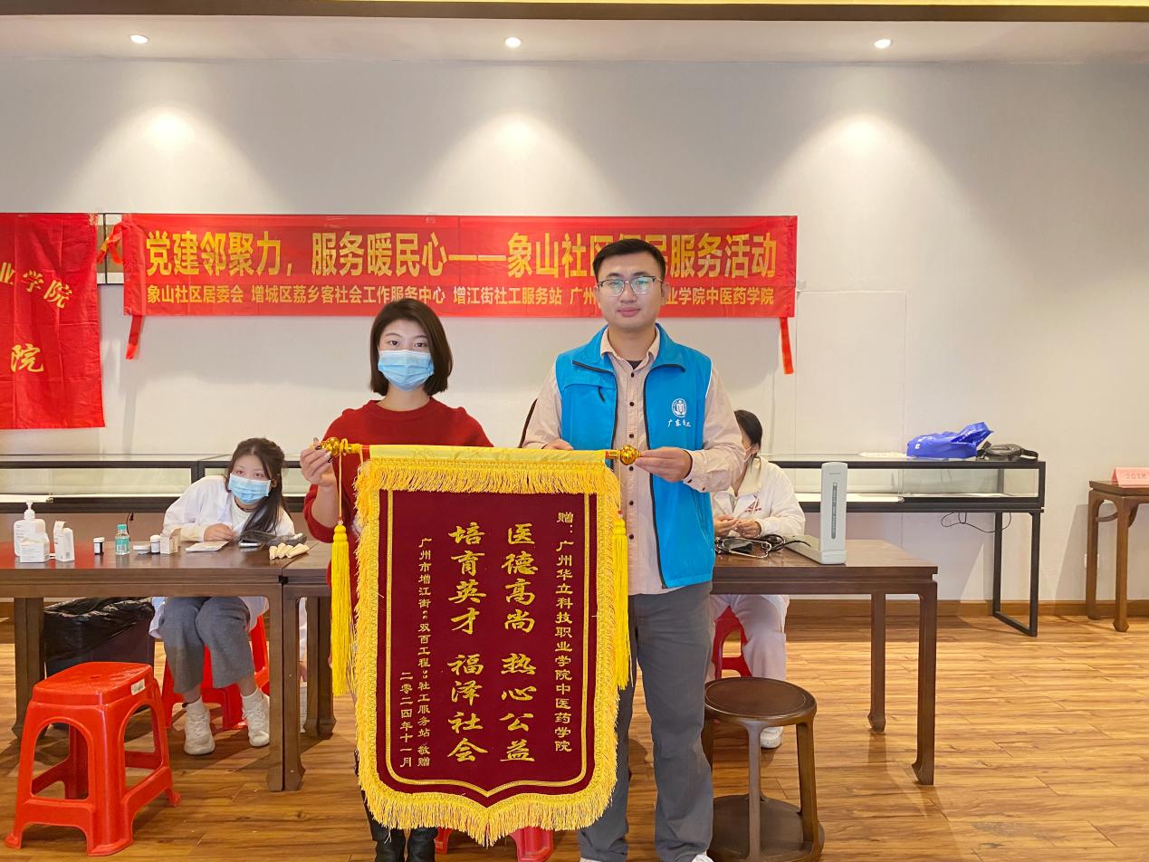 活動最后,增江街社工站贈予我院錦旗,希望雙方能夠繼續(xù)加強(qiáng)合作,打造群眾健康加油站,將為群眾辦實(shí)事落實(shí)到實(shí)處。學(xué)院也將繼續(xù)堅(jiān)持黨建引領(lǐng),錨定高質(zhì)量發(fā)展落腳點(diǎn),推動與周邊社區(qū)及企事業(yè)單位黨建結(jié)對共建,為居民提供高質(zhì)量的健康服務(wù),助力學(xué)院與社區(qū)的高質(zhì)量發(fā)展。