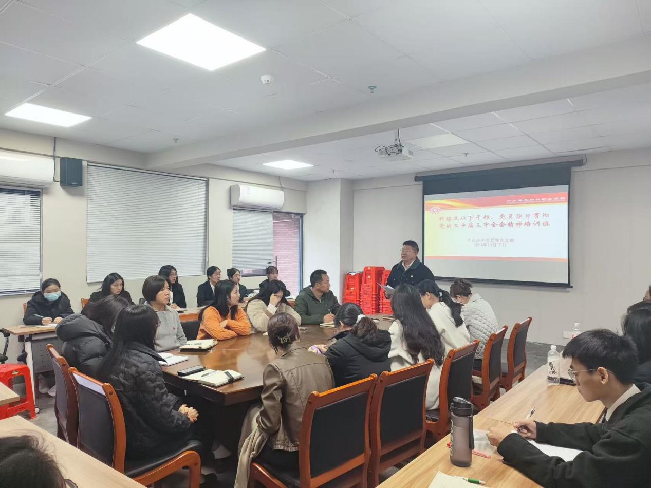 為深入學(xué)習(xí)貫徹黨的二十屆三中全會(huì)精神,切實(shí)把思想和行動(dòng)統(tǒng)一到全會(huì)精神上來(lái),中醫(yī)藥學(xué)院直屬黨支部于1218日至314期間舉辦了科技及以下干部學(xué)習(xí)貫徹黨的二十屆三中全會(huì)精神專題輔導(dǎo)班。37名科技及以下干部、黨員參加了此次培訓(xùn)。
