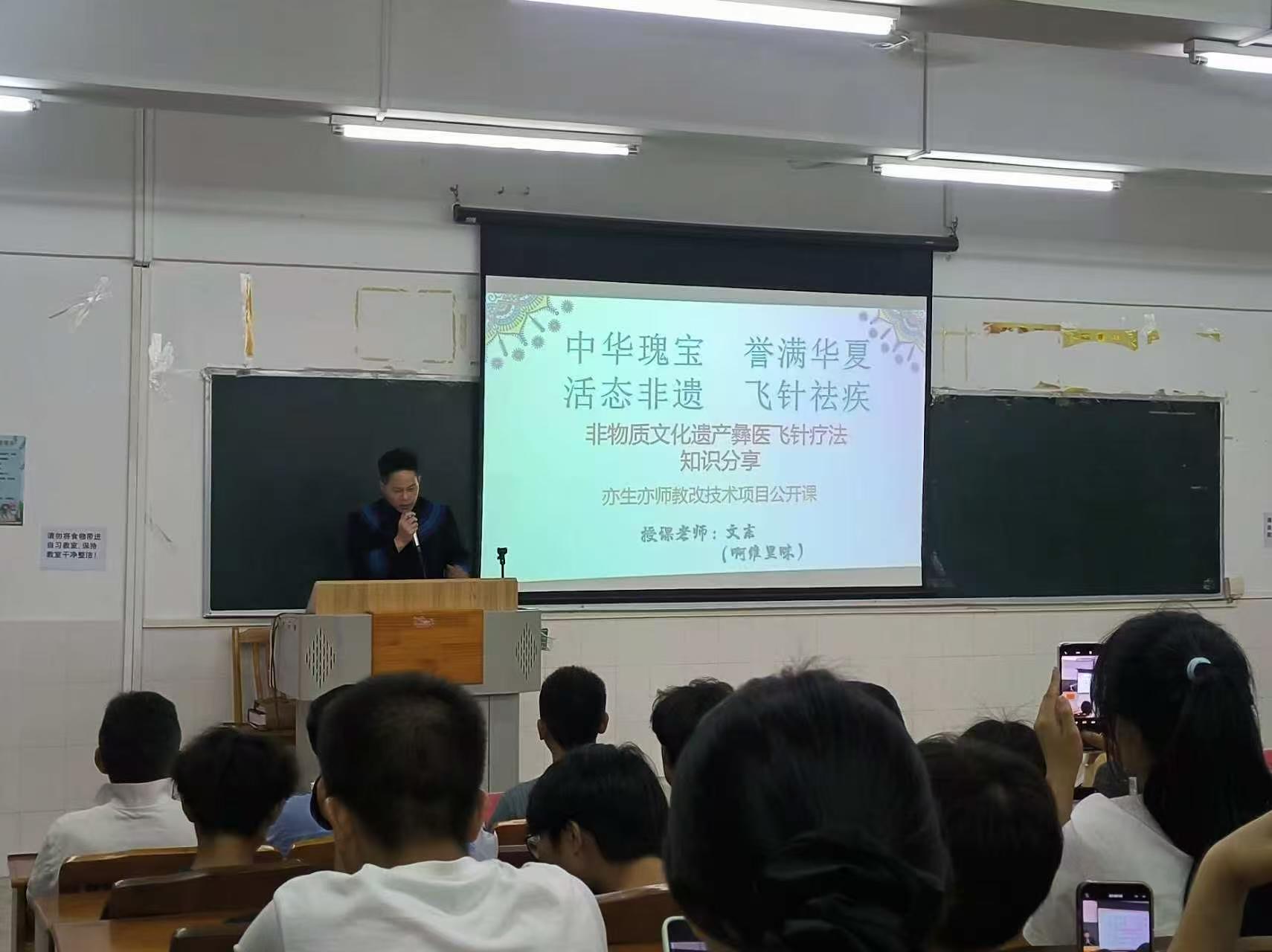 2025年4月17日,中醫(yī)藥學(xué)院"非遺進(jìn)校園"重點(diǎn)活動(dòng)——彝醫(yī)飛針療法專題公開課在校圖書館601舉辦。活動(dòng)特邀非物質(zhì)文化遺產(chǎn)代表性項(xiàng)目彝醫(yī)飛針療法傳承人文東醫(yī)師擔(dān)任主講,百余名師生代表參與本次學(xué)術(shù)交流。