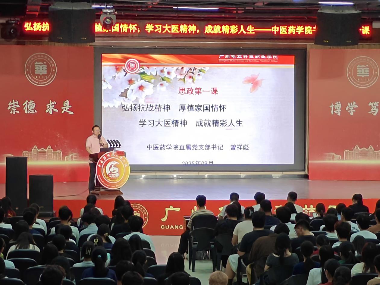 2025年9月8日晚,中醫(yī)藥學(xué)院副院長、直屬黨支部書記曾祥彪,以“弘揚(yáng)抗戰(zhàn)精神,厚植家國情懷;學(xué)習(xí)大醫(yī)精神,成就精彩人生”為主題,為學(xué)院2025級(jí)新生講授了一堂思想深刻、內(nèi)涵豐富的思政第一課。同學(xué)們在莊重而熱烈的氛圍中不僅經(jīng)歷了一場(chǎng)思想深度的精神洗禮,還在課程的指引下系好大學(xué)的“第一??圩印?。
