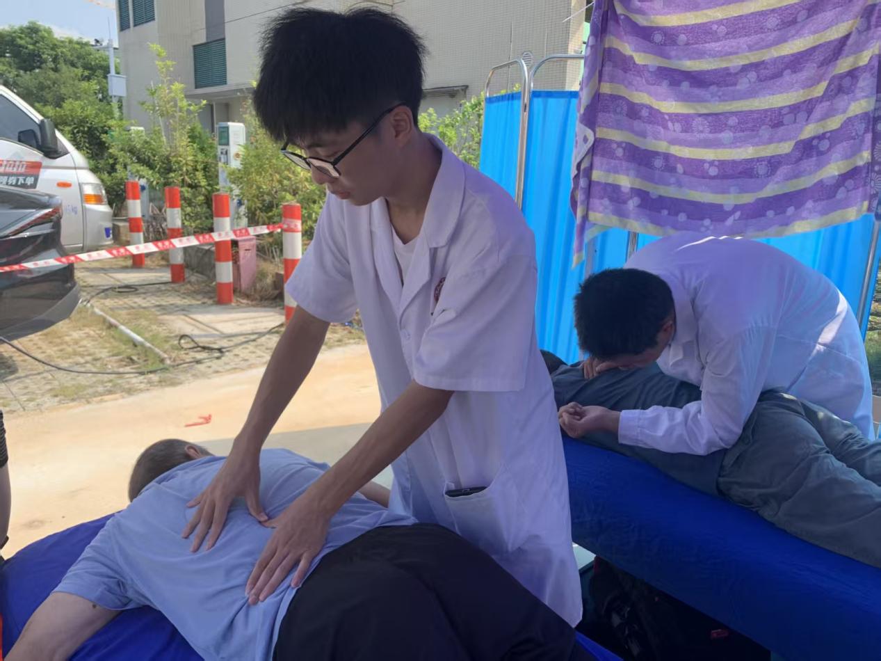 活動(dòng)現(xiàn)場(chǎng),醫(yī)療團(tuán)隊(duì)以飽滿的熱情與專業(yè)的態(tài)度投入服務(wù),迅速搭建起健康咨詢與理療服務(wù)專區(qū),吸引了眾多鄉(xiāng)鎮(zhèn)居民前來(lái)參與。潘菽弢博士憑借深厚的中醫(yī)理論功底與豐富的臨床經(jīng)驗(yàn),為居民們提供一對(duì)一健康咨詢服務(wù)。與此同時(shí),我院中醫(yī)藥應(yīng)用研究所講師團(tuán)與黨建小組的志愿者同學(xué)們充分發(fā)揮專業(yè)所長(zhǎng),為居民提供專業(yè)的推拿理療服務(wù)。面對(duì)患有頸肩腰腿痛的居民,志愿者們運(yùn)用嫻熟的推拿手法,精準(zhǔn)緩解肌肉緊張與疼痛,在服務(wù)過(guò)程中還向居民講解日常護(hù)腰、護(hù)頸的小技巧,幫助居民掌握自我保健方法。