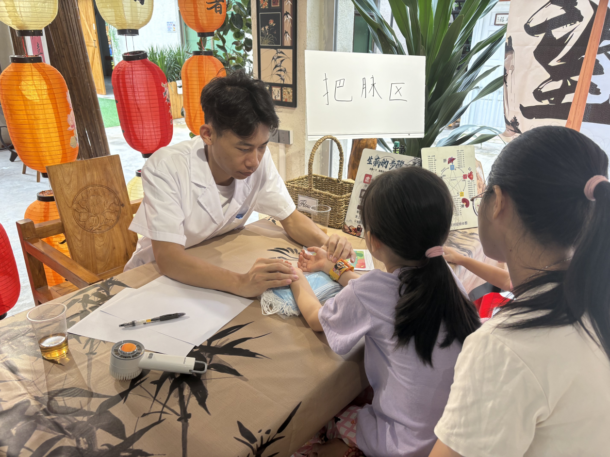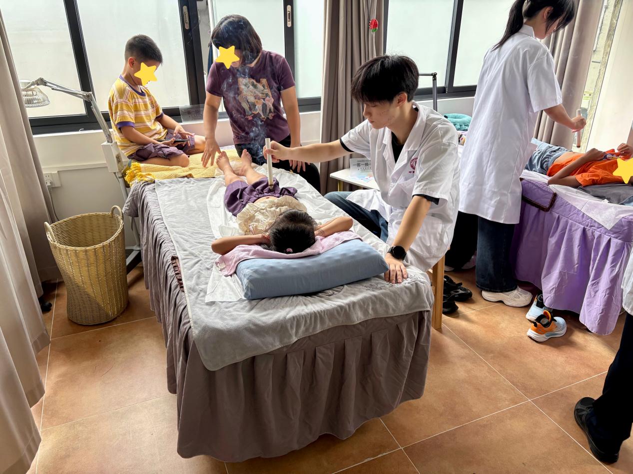 在隨后的治療環(huán)節(jié),艾灸與推拿等中醫(yī)外治法成為舒緩孩子身心的重要媒介。 根據(jù)前一輪診斷評(píng)估的結(jié)果,志愿者們“因人施術(shù)”,針對(duì)孩子們普遍存在的睡眠障礙、腸胃不適等問題,選取相應(yīng)的穴位和經(jīng)絡(luò),施展溫和的艾灸與推拿手法。當(dāng)清雅的艾草香氣在空氣中彌漫,當(dāng)志愿者們用溫暖的手掌輕柔地按摩孩子們的頭部、四肢及腹部,許多原本焦躁的孩子逐漸平靜下來(lái)。這些手法旨在調(diào)和氣血、放松神經(jīng),現(xiàn)場(chǎng)可以看到,一些孩子在接受按摩后,面部表情變得柔和,身體也不再緊繃。整個(gè)過程不僅是技術(shù)的施展,更是一場(chǎng)無(wú)聲的陪伴與療愈,讓抽象的“中醫(yī)”化為了可感、可知的溫暖觸摸。