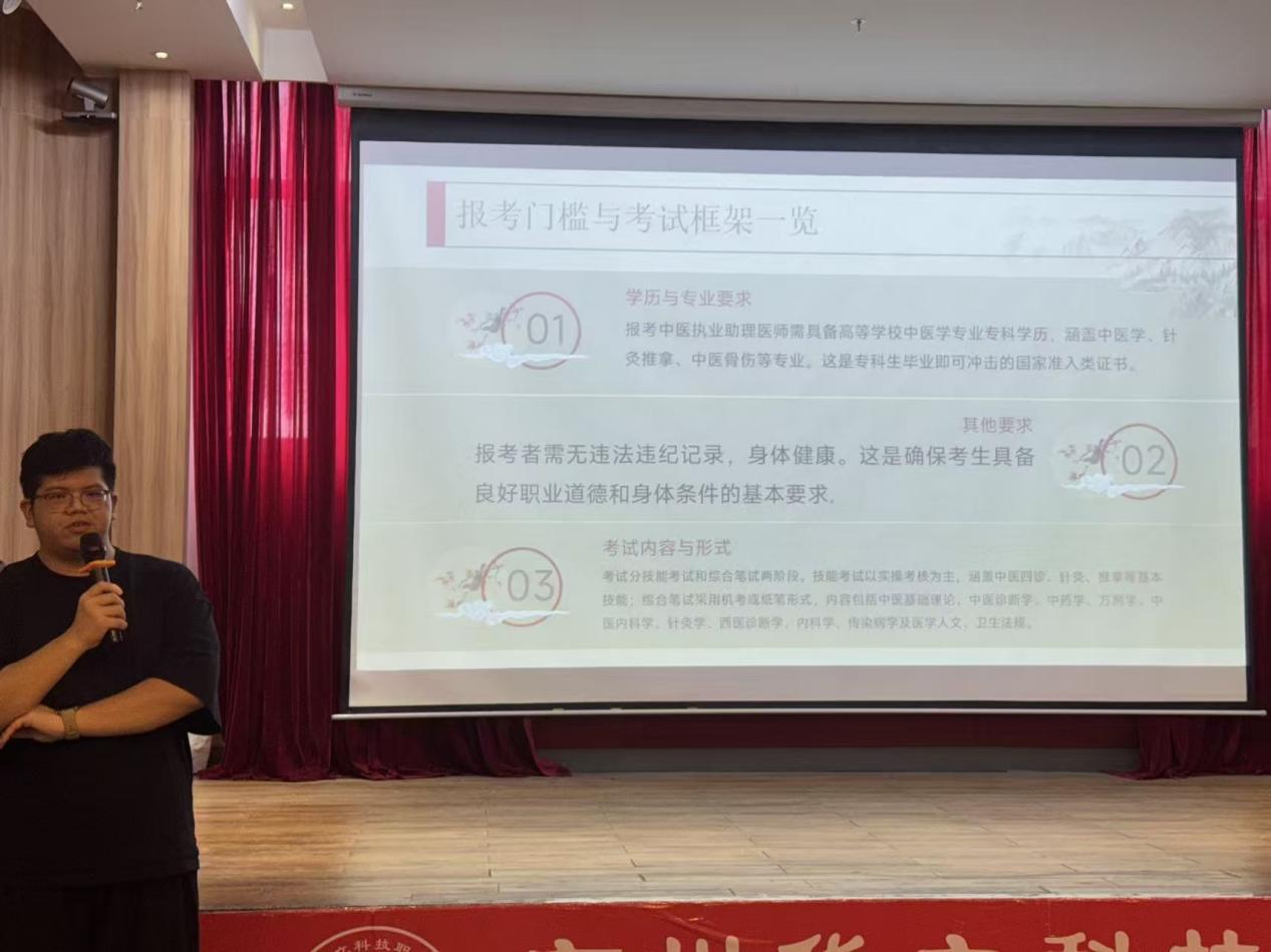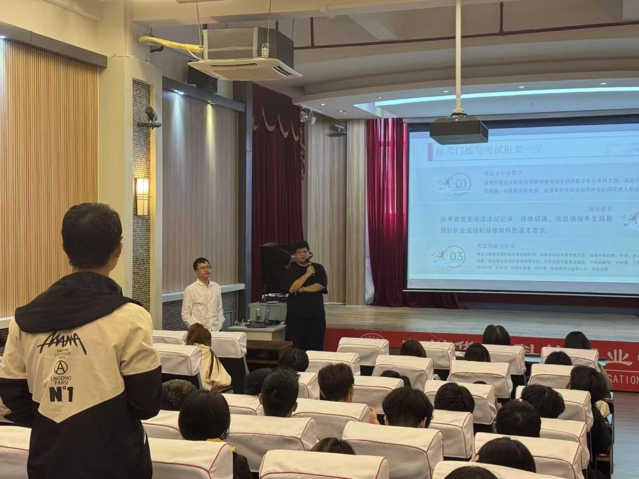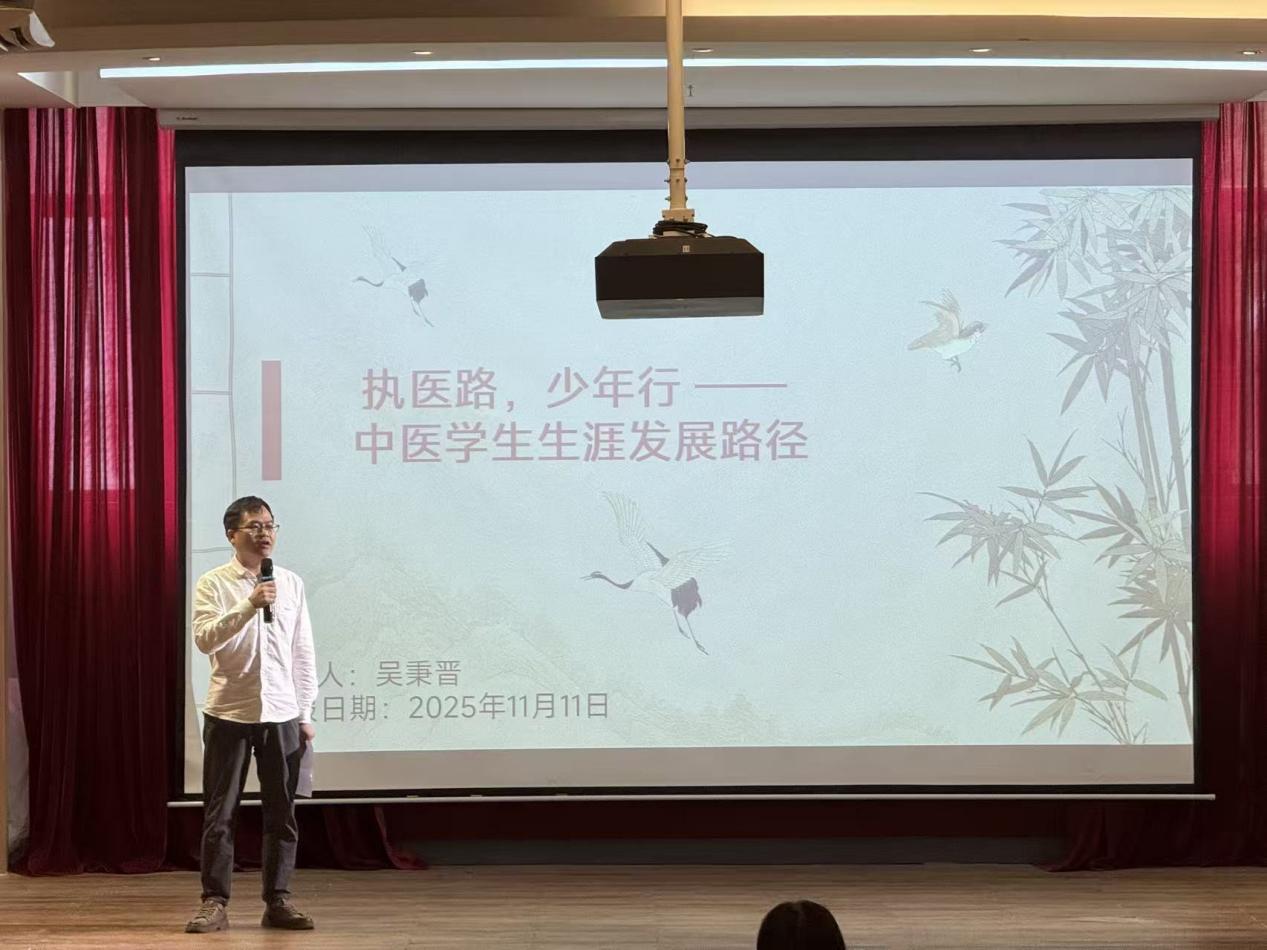 隨后,吳秉晉老師以“執(zhí)醫(yī)路,少年行”為主題開展專題分享。吳老師結合自身經(jīng)歷,從中醫(yī)藥行業(yè)就業(yè)現(xiàn)狀、職業(yè)發(fā)展方向、專業(yè)學習、升學以及考證等多個維度為同學們進行了系統(tǒng)講解,還針對同學們普遍關心的職業(yè)選擇困惑、能力提升重點等問題給出了具體建議。