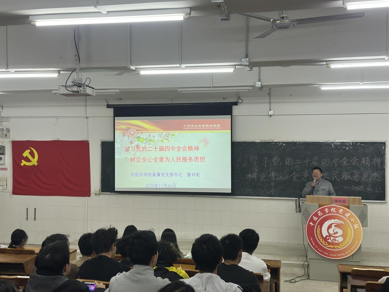 11月26日晚,中醫(yī)藥學(xué)院直屬黨支部在圖書館604教室舉辦黨的二十屆四中全會(huì)精神專題宣講活動(dòng),支部書記、副院長(zhǎng)曾祥彪擔(dān)任主講,130余名25級(jí)學(xué)生到場(chǎng)聆聽學(xué)習(xí)。