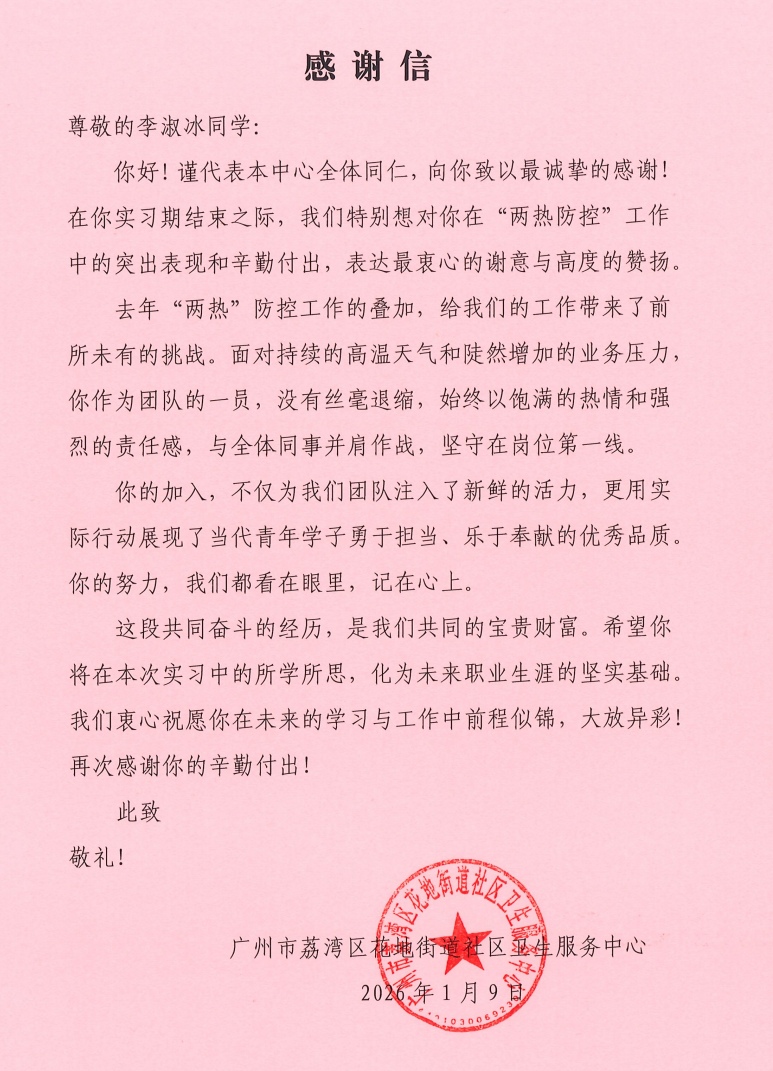 近日,廣州市荔灣區(qū)花地街道社區(qū)衛(wèi)生服務(wù)中心正式向我院發(fā)來三封感謝信,對 2023 級實習生李淑冰(23 中醫(yī) 17 班)、凌桂華(23 中醫(yī) 17 班)、李梓恒(23 藥學 6 班)在基層實習期間的優(yōu)異表現(xiàn)給予高度評價與特別表揚,充分肯定了三位學子的職業(yè)素養(yǎng)與實踐能力。