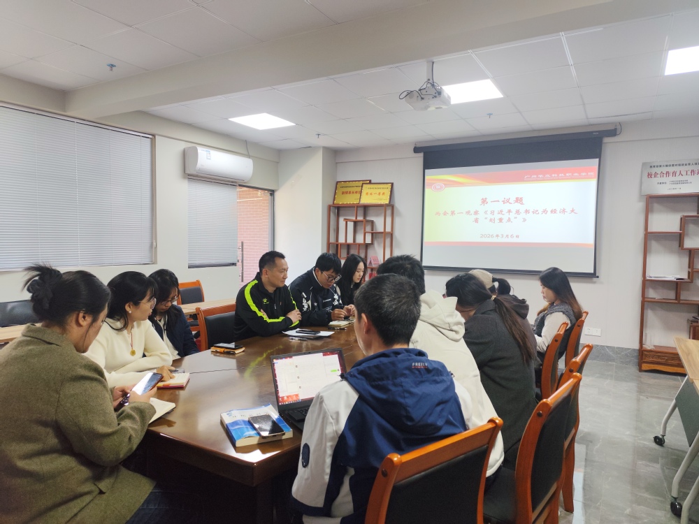 3月6日上午,第二期培訓(xùn)在兩校區(qū)同步舉行。在廣州校區(qū)G1-212會議室,支部副書記陳輝帶領(lǐng)與會人員開展第一議題學(xué)習(xí),聚焦兩會第一觀察《習(xí)近平總書記給經(jīng)濟(jì)大省“劃重點”》,深入學(xué)習(xí)領(lǐng)會習(xí)近平總書記重要指示精神,把握經(jīng)濟(jì)發(fā)展與擔(dān)當(dāng)作為的實踐要求。第一議題學(xué)習(xí)結(jié)束后,黨員同志結(jié)合學(xué)習(xí)內(nèi)容逐一交流心得、暢談感悟,在思想碰撞中深化理解、凝聚共識。