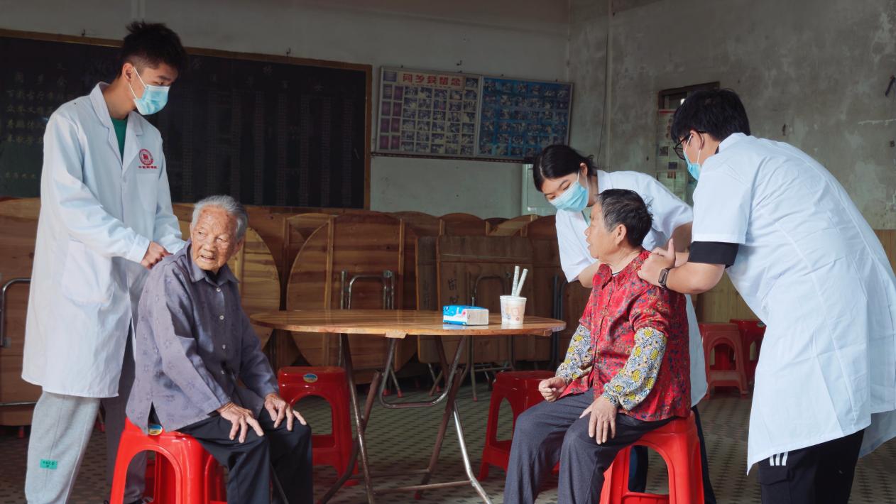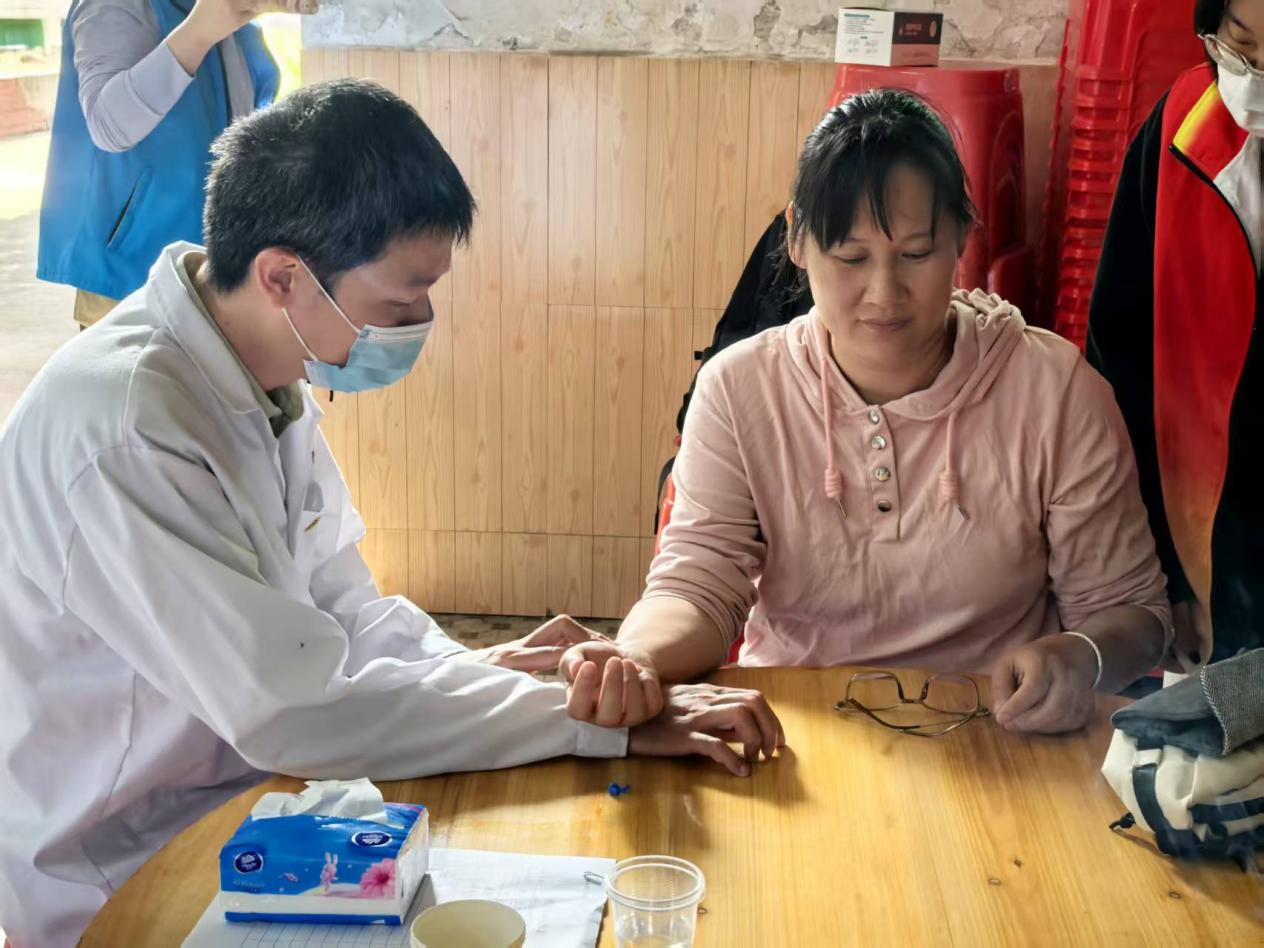 活動(dòng)由潘菽弢、李楚勇、黃榮派三位老師帶隊(duì),學(xué)院黨建小組、中醫(yī)藥應(yīng)用研究所、就業(yè)促進(jìn)會(huì)選派11名同學(xué)組成志愿服務(wù)隊(duì),與社工站工作人員協(xié)同配合,有序開(kāi)展各項(xiàng)服務(wù)。在田心村村委會(huì)集中義診點(diǎn),志愿者們細(xì)致為村民測(cè)量血壓,提供艾灸、推拿等中醫(yī)適宜技術(shù)服務(wù),耐心解答健康咨詢。潘菽弢博士現(xiàn)場(chǎng)為村民脈診,結(jié)合體質(zhì)特點(diǎn)給出個(gè)性化養(yǎng)生建議與調(diào)理方案,用專業(yè)知識(shí)守護(hù)村民健康。