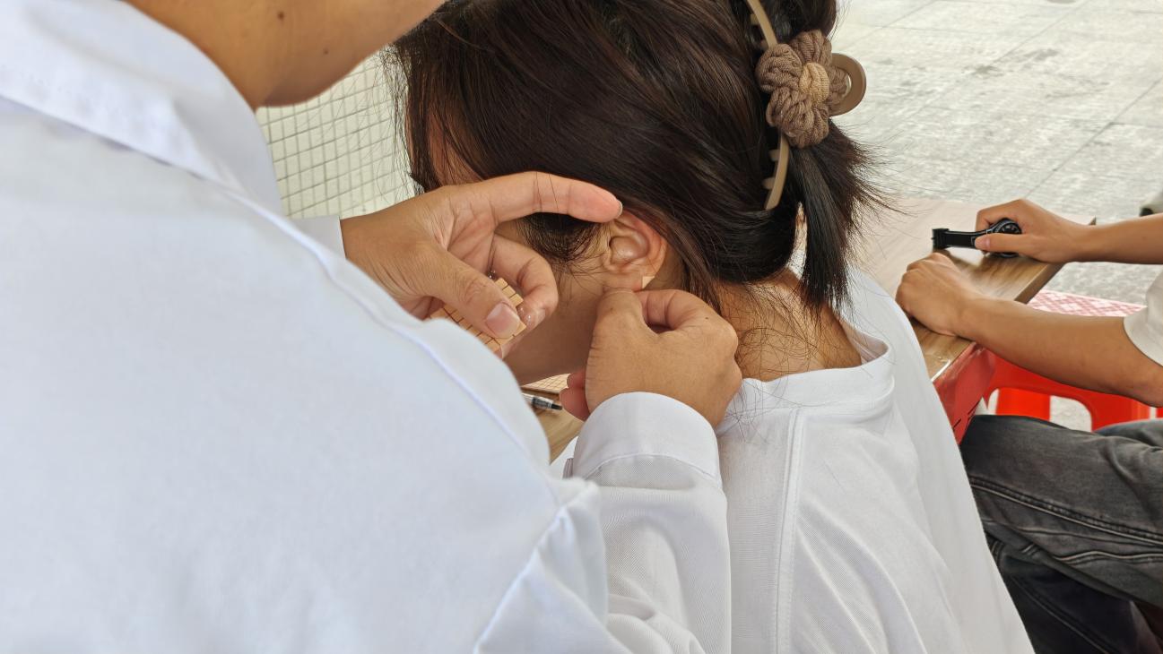 耳穴壓豆作為中醫(yī)特色療法,對緩解失眠、焦慮、頭痛、頸肩不適等癥狀有良好調(diào)理作用。志愿者們憑借扎實的理論知識和熟練的操作技能,先詢問群眾的身體狀況與不適癥狀,再精準選取對應(yīng)的耳穴,輕柔地貼壓在穴位上,并指導(dǎo)群眾日常按壓的手法與頻次,讓大家也能持續(xù)進行自我保健。