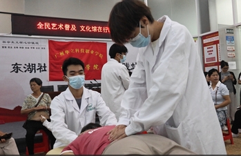 2.杏林惠民?中醫(yī)藥文化進(jìn)萬(wàn)家活動(dòng)。依托中醫(yī)藥協(xié)會(huì)和體育與健康管理協(xié)會(huì),組織師生進(jìn)社區(qū)、養(yǎng)老院、鄉(xiāng)鎮(zhèn)村開(kāi)展義診,提供體質(zhì)辨識(shí)、推拿按摩理療服務(wù);同步開(kāi)展中醫(yī)藥科普講座、養(yǎng)生知識(shí)宣傳,踐行公益,弘揚(yáng)中醫(yī)藥文化。